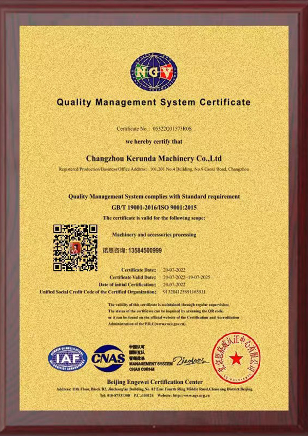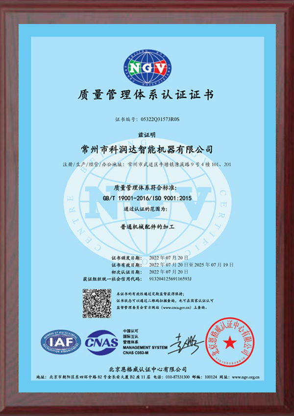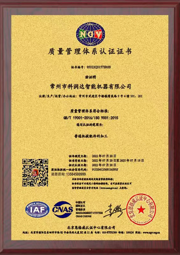 常州市科润达智能机器有限公司拥有各类型数控的精密机械加工设备,能承接大多数精密机械自动化设备制造、机械零件、五金件、生产制造。公司所生产的各种精密零组件产品现已成为相关机械加工行业信得过的供应商之一。公司设备均采用国内外一流品牌制造。产品生产经过激光下料,数控折弯,数控加工中心精密制造。研发团队来自南京航空航天大学,英国帝国理工大学。公司通过了恩格威ISO9001:2015质量认证(恩格威CNAS IAF)。